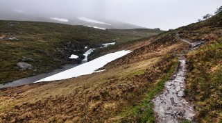 Packar på paltorna och drar ut igen, det är bara 12-14 kilometer från Rösjöhytta till Schultzhytta men jag ska in i Fongenmassivet och över ett litet pass; underlaget är minst sagt krävande på sina ställen. Tvärbäckar och en del våtmark, däremellan en del fina stigar. Gråkallt i dalgången och kylig motvind uppifrån passet, drygt hundra höjdmeter upp till högsta punkten i passet, knappt 900 meter över havet. Väldigt låga moln skymmer bergen, vilket är lite synd - det är ett riktigt fint område jag passerar igenom annars. Högst upp i passet en rejäl snölega, mycket smältvatten, kyla och lite stenskravel, sedan nedför på andra sidan. Springer och fryser och tycker synd om mig själv efter ett extra knepigt vad, möter då en familj med två barn som likt nidbilden av stjärnögd norsk familj på tur med raska steg plöjer över stock, sten och bäck. Tänker att jag får skärpa mig lite och springa på istället för att gny.