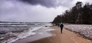 Vid startlinjen pratar jag med Helen och Jonas från Sandsjöbackateamet, Helen har tänkt springa på under sju timmar nånstans, jag har inte tänkt så noga men tror nåt liknande, så vi slår följe ut från start. Vi rasslar iväg på cykelbanor längs kajen ut ur Simrishamn men väldigt snart kommer vi ut på stränderna. Med pålandsvinden är de skoningslösa, där finns inga hårda avsnitt nere i vattenlinjen utan bara tungsrpungen mjuk djupsand, vi gör ett försök med stigarna uppe i skogskanten men trasslar snart in oss i snår och får banka oss ut i stranden igen. Andra försöker upprepade gånger springa längre ner mot vågfronten men även de väder tillbaka, det är bara att acceptera att det är ett par kilometer av tuff sandlöpning att tugga i sig innan stigarna börjar.