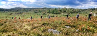 Efter att ha rundat Långevatten och tagit oss över platser med på kartan fantasieggande namn som Valåsberget och Rävuledal är det en kilometer av lite mer tuff obanad terräng kvar. Över små svackor och upp på torr mark där det bitvis går bra att springa på hällarna, bitvis mindre bra. Sen ner igen. Det är bara att hålla gott mod och kämpa på. Peppar gruppen med distansangivelser till det stigslut vi siktar på; vet inte om det hjälper men efter en sista brötforcering vid nordöstra Rubbesjö kommer vi till sist ut på en stig iallafall.