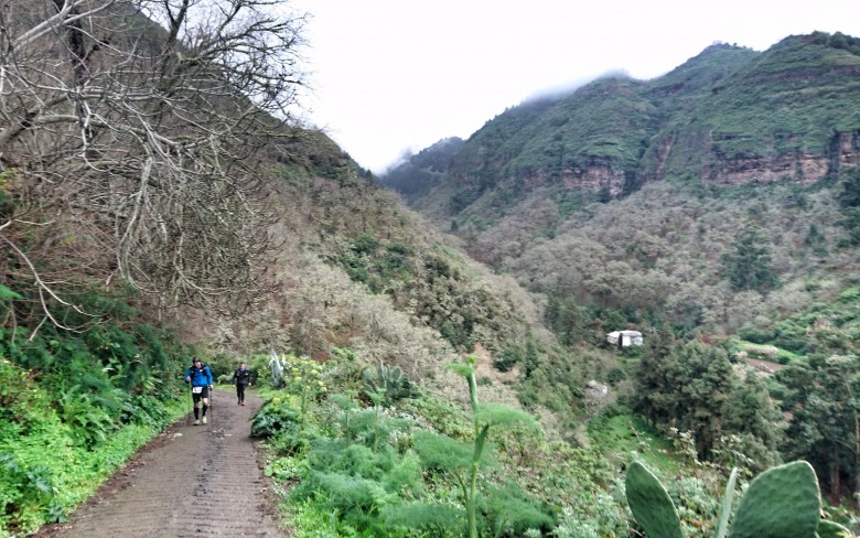 Från Tamadaba går det nedför, bitvis ganska brant, bland annat en passage på några meter med stöd av ett rep - vilket leder till tvärstopp i den långa kön. Fördelen är möjligen att fältet luckras upp lite efter att vi passerat. Jag upptäcker redan här att jag har ett problem som kan bli ganska allvarligt; jag har inte räknat med att stigarna här uppe skulle vara såpass hala. Det ligger en lätt dimma över bergen och marken är omväxlande våt och fuktig. Att det är lite kletig lera på platten eller i motluten är inte ett stort bekymmer men i nedförsbackarna blir det såphalt och jag får dåligt till inget fäste - det är bara flitigt jobb med stavarna som ger mig möjlighet att hålla rimligt tempo nedför. Försöker trippa lätt och spara låren så gott det går, men det är rejält branta nedförslöpor på sina håll.