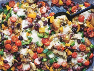 5. Dela under tiden tomater och kronärtskockshjärtan i halvor. Skär paprikorna i bitar. Ta ut plåten igen och lägg ut tomater, paprika, kronärtskockshjärtan och hela oliver. Bryt mozzarellan i bitar och fördela över plåten. Strö över citronskalet och rosta i ytterligare 10 minuter.