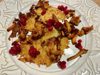 Dela stora svampar i halvor och stek i en panna med smör och timjan. När svampen fått lite färg – salta och peppra. Servera rårakorna med svamp och lingon.