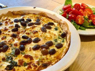 Tina och fräs bladspenaten i olivolja tillsammans med den tunt skivade gula löken. Lägg spenatblandningen i det förgräddade pajskalet (ta bort folien om du hade det när du förgräddade). Strö på fetaosten. Vispa samman ägg och mjölk, 1 tsk salt och ½ tsk peppar till äggstanningen – och slå över pajen. Lägg på oliverna och skjuts in i ugnen. Cirka 40-45 minuter, 175 grader.