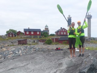 Att sen ge sig ut och styra fören mot Understen och den längsta passagen över havet var än mer magiskt. Havet låg lugnt och vi såg absolut inget annat än en suddig horisont som gick ihop med den gråmulna himlen. Efter några kilometer började vi kunna ana fyrarna, tre till antalet, på Understen och ju närmare vi kom desto bubbligare blev vi av lycka då vi insåg att vi faktiskt skulle fixa det. Med stenarna under fötterna på Understen gjorde vi det största V-tecknet hittills under resan med våra paddlar. Vi hade klarat att paddla kajak över hela Ålands hav!