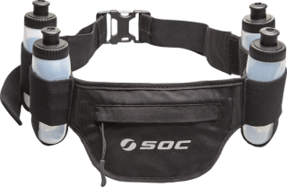 Vätskebälte från Stadiums egna märke SOC. Fyra flaskor med 12,5 cl per flaska samt ficka med dragkedja. Förvaringsfack med dragkedja och reglerbart spänne i plast
