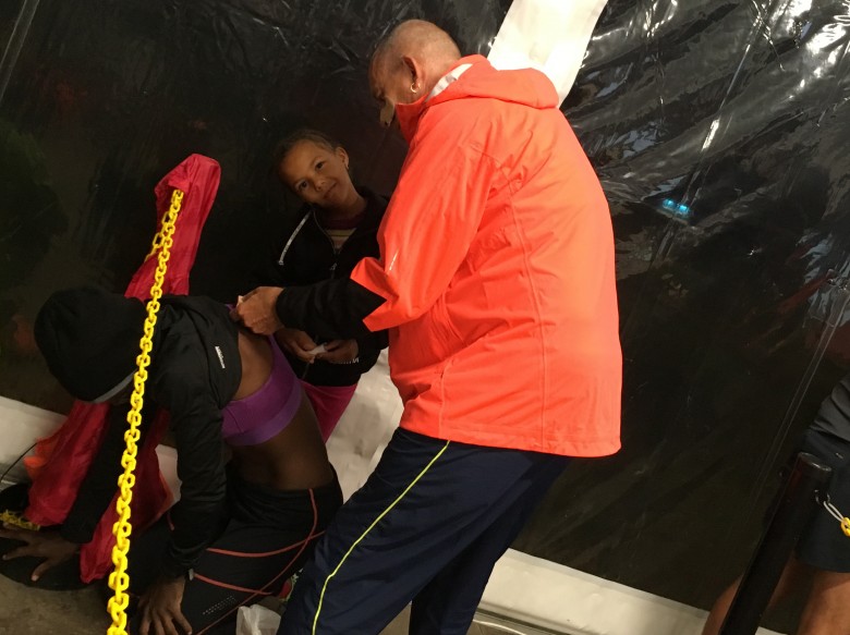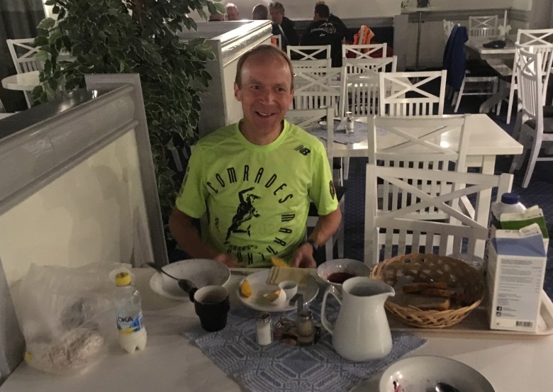 Inga konstigheter, jo lite. Bovetegröt istället för vanlig havregrynsgröt, tydligen mildare för magen. Ett ägg, några smörgåsar med laktosfrit smör och ost blev det också innan det 02.45 var dags att hoppa på bussen. 75 minuter senare var vi på plats i Berga by. Alla samlades kring eller i tältet, elit som motionär, och det kom ett litet lätt duggregn men annars en helt ok morgon för löpning. Runt 12 grader.
