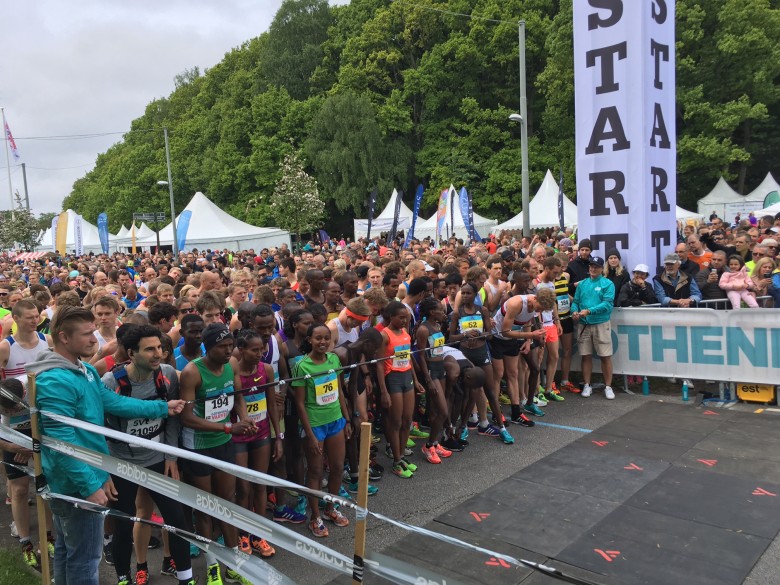 Så här såg det ut innan start, trångt och laddat! Konsterar att det var ett bra Varv. Grymt imponerad av segrarna. 59.35 och 1.08.01 på herr resp dam. Det är oerhört snabbt; några av dom bästa loppen på halvmarasträckan sett till alla halvmaror!