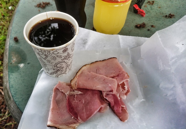 Vaknar förhållandevis pigg efter en kort natts sömn, tömmer och sopar ur den lilla campingstugan som ligger fint nere mot vattnet. Gårdagens solsken har bytts till lätt grå skyar, lite duggregn hotar. Under natten har det regnat något tror jag. Receptionen har hunnit öppna och jag kan komplettera mina få kvarvarande kalla plättar med en risifrutti, kaffe och en macka. Fyller också upp mitt godisförråd samt drickaflaskor. Den Umara jag startade på är slut, jag fyller på med vad jag hittar i butiker längs vägen, ofta cola ibland någon annan sockersötad dryck eller sportdryck på flaska.