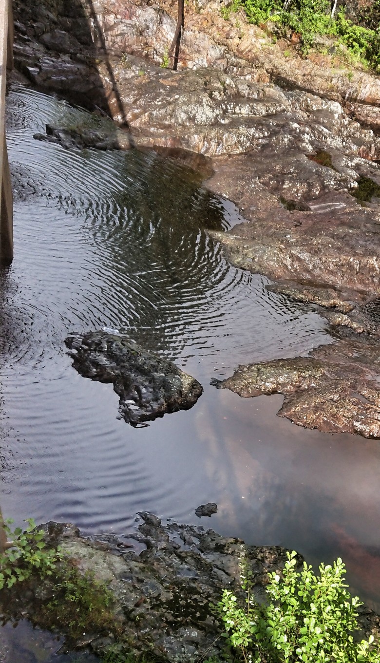 Framåt Grythyttan drar molnen ihop sig, vinden mojnar och det duggregnar lite. Stannar och käkar en så ovanlig kombination som banan och pizzasallad nedsköljt med en skvätt kaffe. Jag har ingen brådska i grunden men jag vill gärna komma till Fredriksberg innan klockan 19 då Coop där stänger, det är mitt sista tillfälle att fylla på flaskor och godisförråd, så inget långt stopp nu. Därav pizzasallad och banan. För övrigt riktigt fin väg genom norra Värmland via Grythyttan, Hällefors, Silvergruvan och Gåsborn. Gamla små brukssamhällen inbäddade bland skog och vackra små sjöar, idylliskt så det sjunger om det. Vid Silvergruvan tappar jag en av mina vattenflaskor ur bakracket precis när jag kör över dammen där. Stannar och ska hämta den, har för tillfället en bil med släp bakom mig; han stannar också, tittar ut och säger 'Den fan for över kanten' på klingande värmländska. Och mycket riktigt, nedanför dammen, mitt i den halvtorra strömfåran långt utom räckhåll ligger den trilskande flaskan. Irriterande men inte mycket att göra - får köpa något som går att använda istället i Fredriksberg.