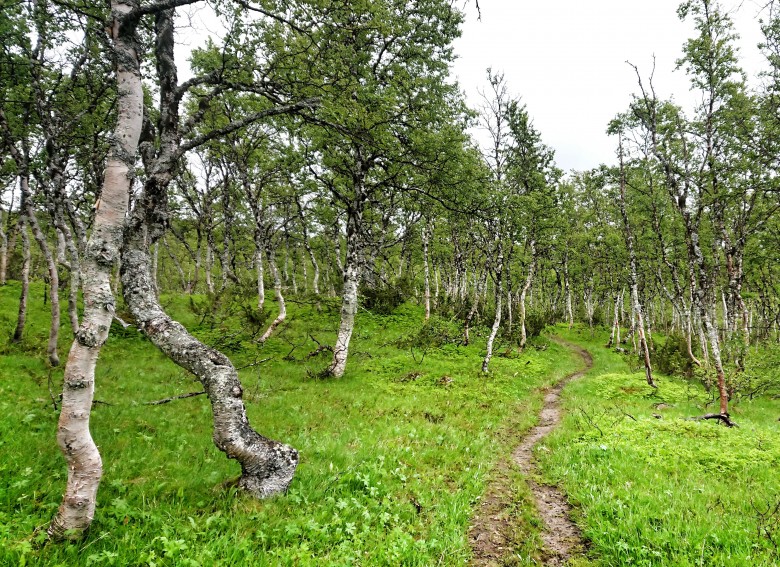 Andra sidan passet erbjuder finare ehuru fortsatt blöt stiglöpning på bergssidan och sedan in i knotig skogsmark ner mot Schultzhytta. Nere i skogen är det mildare väder och vyerna öppnar sig över en mycket vacker skogbeklädd dalgång som mycket riktigt för tankarna till Alperna. In på hyttan, som är stor och bemannad men tom på gäster, är det tyst varmt och stilla. Kommer in och får av mig blöta skor och strumpor och jacka, får en kopp kaffe och ett par mackor av stugvärden som är en mästare på att låta tystnaden verka. Sjunker stilla ner i en fåtölj en bit bort och läser, redo att byta några ord om jag känner för det men inte så nära att det krävs eller blir obekvämt. Jag trivs i stillheten och kollar mina papperskartor och äter mina mackor. Det är lunchtid och tidig eftermiddag och jag är fast besluten att åtminstone ta mig 16 kilometer till och nå Prestöyhytta innan jag gör kväll.