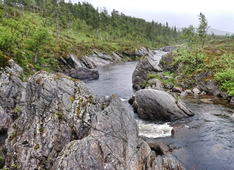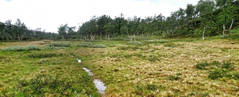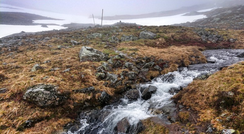 Packar på paltorna och drar ut igen, det är bara 12-14 kilometer från Rösjöhytta till Schultzhytta men jag ska in i Fongenmassivet och över ett litet pass; underlaget är minst sagt krävande på sina ställen. Tvärbäckar och en del våtmark, däremellan en del fina stigar. Gråkallt i dalgången och kylig motvind uppifrån passet, drygt hundra höjdmeter upp till högsta punkten i passet, knappt 900 meter över havet. Väldigt låga moln skymmer bergen, vilket är lite synd - det är ett riktigt fint område jag passerar igenom annars. Högst upp i passet en rejäl snölega, mycket smältvatten, kyla och lite stenskravel, sedan nedför på andra sidan. Springer och fryser och tycker synd om mig själv efter ett extra knepigt vad, möter då en familj med två barn som likt nidbilden av stjärnögd norsk familj på tur med raska steg plöjer över stock, sten och bäck. Tänker att jag får skärpa mig lite och springa på istället för att gny.