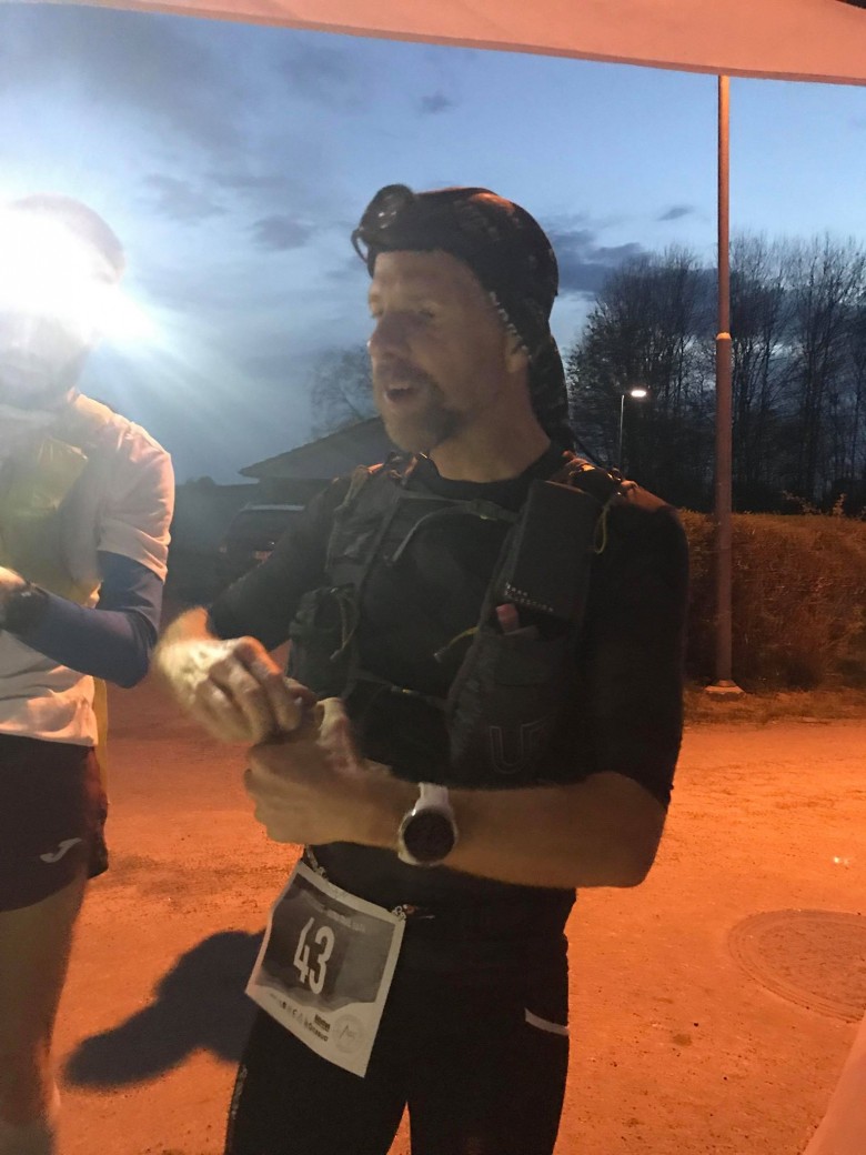 I skogen vid Aspen trivs jag, det är en riktigt skön böljande skogsstig. Solnedgången blir till skymning och vi har tänt pannlamporna när vi kommer in till första kontrollen vid Gunnilse. High five med Helen och Jonas som servar, dricka, äta lite godis och fylla flaskor, sedan vidare. Nästa stopp Dammekärr. Ut på Vättlefjällsleden i natten, läcker mörkerlöpning på smala men tydliga skogsstigar. Ibland på höjden ibland längs sjöar som man bara anar. Stugan i Dammekärr och lederna kring den känner jag igen från Vättlefjällsmarschen här om året, i depån står David och Mervi som jag också känner igen. Tryggt och familjärt, fyller flaskor, äter och så ut och iväg. Lätt fart, lugna kilometrar som bara tickar på. Natten fortfarande varm.