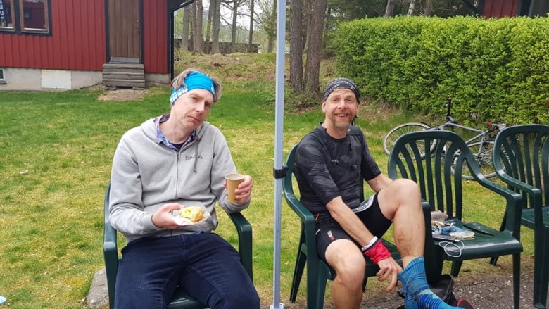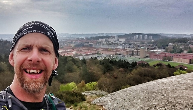 In i Hisingsparken med fina stigningar och fantastisk utsik över staden kring Slätta damm. Vid Kvilles klubbstuga står Anders och väntar med min dropbag. Huvuddelen av de som är kvar i startfältet har passerat, det är någon enstaka löpare kvar på banan bakom mig men det är stora tidsdifferenser och lugnt i depån. Jag har lovt mig själv lite mer paus här, sitter ner och byter skor och strumpor, det har känts lite stumt under fötterna på sistone och stortårna är less på det hårt sträckta tyget från tåstrumpan. Vädrar fötterna och kollar till dem, lite varmmosiga men inga issues alls. Får soppa och bröd och lite kaffe. Stoppar undan den stora pannlampan och lägger istället ner min mindre petzl i ryggan, har därmed två små lampor med mig för kvällens bravader, jag har redan en minimal silvalampa som backup. Halar fram två wienerbröd ur dropbagen, ett åt mig och ett åt Anders - man får allt tänka lite på funkisarna som går upp mitt i natten, släpar med väskor och donar med allt kringjobb för att vi ska få en löparfest. Så ör det gott att ha en lite vanlig fika innan det är dags att dra vidare.