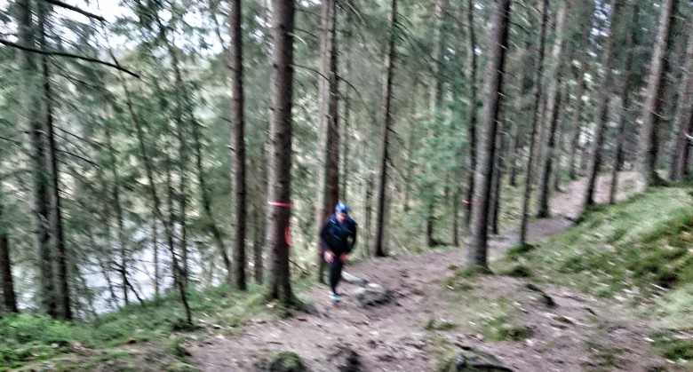 Äntligen uppe, stigen ner mot Fässberg går snällt nog på en av de finare stigarna och vi snirklar och långsamt ned mot dalen, korsar vid kolonierna och ut igen på andra sidan. Blir distaherad av en kvinna som frågar om det brinner nånstans då hon sett rök och missar lite navigation men hittar tillbaka till banan vid Steinbrenner, hittar även min Hustru och jag får sällskap in på Circle K där jag bestämt mig för att inhandla korv och mos och kaffe. Blir hängande här en stund, regnet vräker plötsligt ner där ute och jag känner mig modfälld. Får perfekt pepp och push ut i regnet, på med jackan in med lurar i öronen och bara mata på igen. Det är visserligen uppför mot Sisjön men underlaget är lätt, det är bara att hasa på. Med korta korta steg och flitig stavteknik kan jag ännu elva mil in prestera något som liknar löpning om man är välvilligt inställd och kisar med ögonen på rätt sätt. Känns ändå bra på nåt sätt.