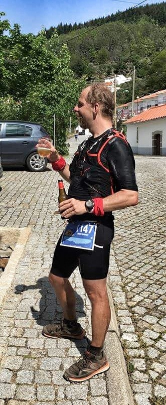 Med en kilometer kvar dyker banan ner den sista lilla biten in i Manteigas; det går brant nedför förbi huset där vi bor och Elsa, vår värd, kommer utspringande och hejar. Hon undrar om jag vill ha öl och det kan jag ju inte tacka nej till. Stannar till och får ett glas med kall skummande pilsner som smakar stört gott. Tar några munnar och lämnar resten till Gustav som redan gått i mål för att fortsätta mot målet. Sara springer med en bit nedåt.