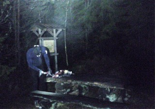 Klockan halv elva på onsdagkvällen har vi parkerat bilen i Hyssna och kan axla ryggsäckarna, vrida på pannlamporna och komma iväg. Det lätta duggregnet upphör precis när vi sticker iväg och det är därefter kallt men stabilt väder under hela passet. Leden är en rundslinga som ringlar sig mellan kulturbygder och skogsmark, med ganska bra kupering och med ett omväxlande underlag. Ganska mycket grusväg, en hel del duktigt teknisk stig och någon enstaka stump asfalt.