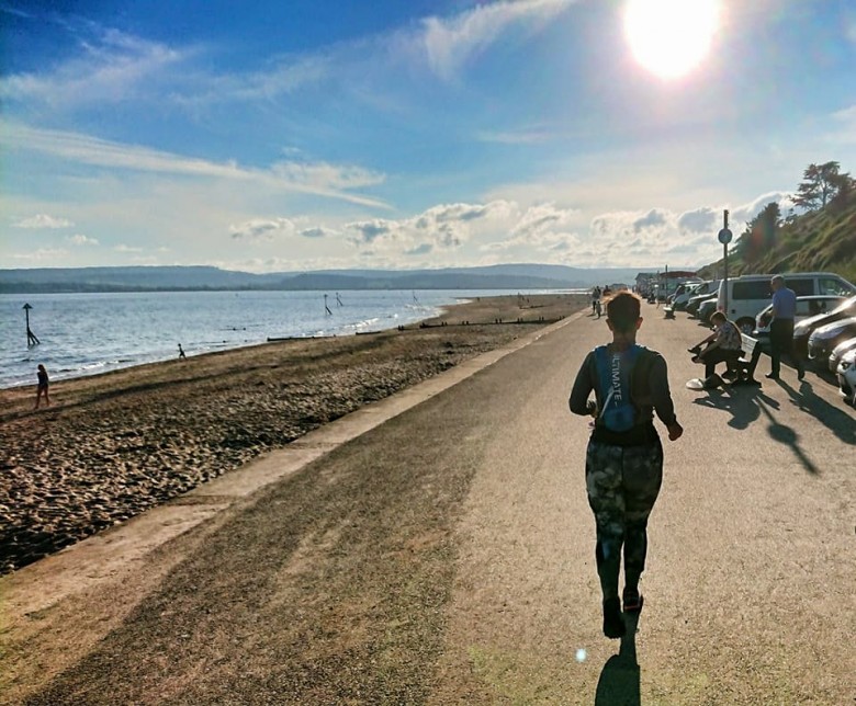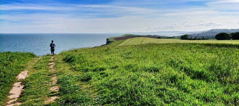 Vi lämnar Sidmouth vid bättre mod än vi kom, löpsteget lättare, solen varmare och andhämtningen lugnare. Dessutom avgjort färre klättringar på sista två milen av loppet. Efter Sidmouth dock uppåt igen. På höjderna hittar vi ett bättre flyt med mer och snabbare löpning än tidigare, pausen har gjort nytta och det är roligt att springa igen. Vi springer åter längst ut på en klippa med gräs och åkrar på ena sidan och havet på den andra. Kilometrarna tickar undan; nedför mot sista stoppet i Budleigh salterton, lite sång i medluten lättar upp, till mötande vandrares stora förundran.