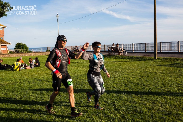 Först ytterligare en lång löpning längs ännu en strandpromenad, sen uppför en sista gång till hundrametersnivån. En halvmil till mål från toppen och nu är det bara att tugga på tungan sista biten. Nedför en sista krok och så kommer vi ut på strandpromenaden i Exmouth. AM frågar för första gången hur långt det är kvar och tycker det är förfärligt mycket med 1600 meter. Jag påminner om att vi sprungit nästan fem mil och att det inte är några backar kvar nu. Vi ökar farten och noterar loppets snabbaste kilometer på upploppet; arrangören har en eskortlöpare som visar rätt in i målet och så är vi äntligen framme.