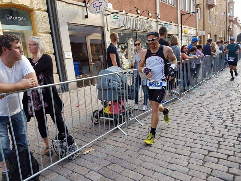 Lite långsammare uppför själva puckeln, så nedför mot Ängörondellen där publiktemperaturen stigit till kokpunkten. Vinkar till Hustrun som är precis överallt och fortsätter ut på fastlandsslingan. Vägarna här är lite mer tekniska, en del böljande fram och tillbaka och korta upp och ned. Inga höjdmeter att tala om men bara en aning mer att hålla reda på. Fortfarande väldigt skön cykelåkning hur som helst. Räknar ner kilometrarna och börjar längta in till transition; kör på ganska bra hela vägen men släpper lite på farten sista fem-tio km. Äter min sista bar och dricker ur sportdrycken. Börjar tänka på att springa. Kollar klockan och ser att cykelrtiden hamnar på 5:19:30 - när jag senare kollar min tid från 2010 ser jag att jag gjorde 5:19:23 då. Mycket nöjd med cykeltiden tar jag mig igenom transition igen, funderar på att gå på toa men förkastar idén och lufsar ut på löpet. Jag vet att det här kommer bli tungt; jag har cyklat alldeles för fort och har nästan inga långa långpass löpning allmänt eller löppass efter cykel i synnerhet i boken den här säsongen. Jag får ta det lugnt och lite på rutinen och på moralen (pannbenet).