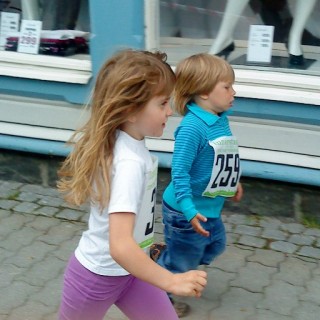 En spänd stämning råder vid startlinjen, lika mycket föräldrar som barn tror jag bestämt. Kids på längder kortare än 130 cm vill gärna ha mamma eller pappa med. Jag oroar mig lite för att några kortlingar ska bli nedtrampade i folkmassan men allt går lugnt tillväga och plötsligt är startfältet iväg. Löpglädjens fördämningar brister och det springer barn åt snart sagt alla håll - en helt fantastisk syn. Ett par kvarters raksträcka, så passerar den stora klungan en vätskekontroll och försvinner runt ett gathörn. En vänstersväng till och sedan är man inne på det långa upploppet. Och i mål väntar medalj, ära och berömmelse.