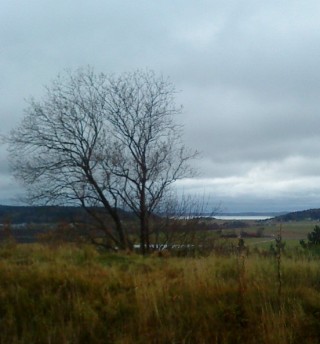 Upp för kyrkbacken till bräckan, vätskebältet är tomt så här långt men den trogna bräckapumpen förser mig med friskt och gott vatten filtrerat genom den massiva moränen. Ett par godisbitar fanns lätt tillgängliga på utställningen också så de fick åka med i fickan. Unnar mig en kortare promenadpaus, tittar på utsikten och äter en hallondragster. Vyn växlar ständigt här uppe, ibland ligger Lygnern som en spegel, ibland som ett grått och hotfullt innanhav. Idag är det något mellanting, lugnt vatten men grå skyar, rostiga löv och så en kråka som kraxar lite höstlikt. Stämningsfullt. Nog pausat, upp i fart igen och ner på den lilla stigen mot Tom som löper under svalhögarna.