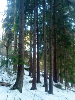 Vid södra foten av Västerberget svänger jag in på den sista halvmilen av Sandsjöbackaloppets tilltänkta sträckning. Stigen som försvinner in i Mölndalsravinen är trampad av ett fåtal fötter och genom den smalaste delen av ravinen är det fantastiskt fin löpning, lite uppför längs den lilla bäcken på botten av den smala naturformationen. Så vidgar sig ravinen till en bred U-formad dalgång där botten är täckt av ett plockepinn av vindfällda träd, halvt nedsjunkna i den vattensjuka marken. Här finns en hemlig nästan aldrig använd stig som klättrar brant uppför på östsluttningen och slutar vid ett av rösena på västerberget. Stigen har varit helt oanvänd under vintern, verkar det, för här finns inte ett spår. Ändå är det en ganska bra väg upp på västerberget, inte alls lika ohemult knagglig som stigen från söder - och dessutom slipper man isen från alla gamla fotspår och det vattendrag som alltsomoftast rinner fram där man ska upp från det hållet.