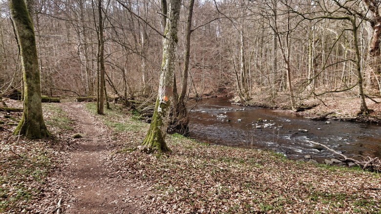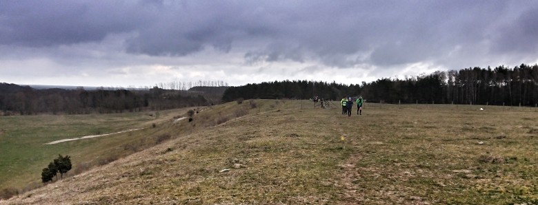 I hamnen bjuder Buhres fisk på saft och tunnbrödssnittar i två smaker, ägg/matjes och lax/räkor. Båda smakar utmärkt. Jag fyller upp en softflask med saft och drar vidare med minimal stopptid. Jag och Helen delar på oss här och jag trummar på framåt, trots att vi hållit ett högre tempo än jag tänkt på i förväg och trots att inledningen varit ganska tuff känner jag mig ohemult fräsch. Ut från Kivik norrut till Vitemölla på gräs högt över havet, sedan ner till stranden vid Haväng innan vi slutgiltigt lämnar havet för bäckraviner och inlandslöpning. Vi följer Verkeån västerut, inåt uppåt, ömsom vacker lövskog som ännu längtar efter att grönska, ömsom öppna hagmarker i vallar högt över åbrinken. Just som vi närmar oss Brösarp viker banan norrut, vi korsar en gammal järnväg genom att springa genom (!) ett utsökt vackert gammalt ånglok och fortsätter därefter stilenligt på gammal till cykelbana omvandlad banvall. Det är platt och lättsprunget grus i tre-fyra kilometer innan vi åter vänder västerut. Tyvärr går banvallen längs kanten på Ravlunda skjutfält som har något slags slutövning just idag - det är kulspruteknatter och riktigt tunga salvor mest hela tiden när vi springer här så den sköna naturnära löpning det skulle kunna vara kommer lite av sig just idag. Jag väljer att plugga in musik och zona bort lite efter tremilskontrollen som passeras här den med.