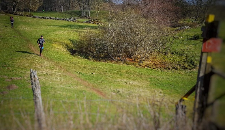 Vid marapasseringen är vi åter inne på stig och det går upp och ned i fältkanter, genom mjuka sjogsmarker och över hagar. Banan varierar sig ständigt men är i det mesta ganska lättlöpt. Det är i princip inga partier med svårlöpt teknisk skogsstig som jag är van vid från till exempel Hallandsleden, Sörmlandsleden eller vandringsstråken kring Göteborg. Det enda tekniska är alla färister och gångbroar över elstängsel kring hagmarkerna, som vi säkert passerar ett hundratal under dagen. Farten är god och jag har hållit energiplanen, fram till runt 45 kilometer känner jag mig i det närmaste ostoppbar. De sista kilometerna in till sista depåstoppet vid Vantalängan, 50 km, går det lite segt och jag får gräva lite. Sedan får jag vingummi och kaffe och en promenadpaus på några minuter innan jag tar mig an de sista åtta kilometerna till mål. Det är fantastiskt vacker lövskogslöning, åter i Verkeåns dalgång. Lite av min kraft börjar rinna ut i marken här me kanske beror det mest på att jag är nära målet och börjar kolla på tider, vilket får mig att börja pressa lite mer. Ser att under 6:30 är möjligt vilket skulle kännas fint. Har dock inte tid att glida utan måste bomba på.