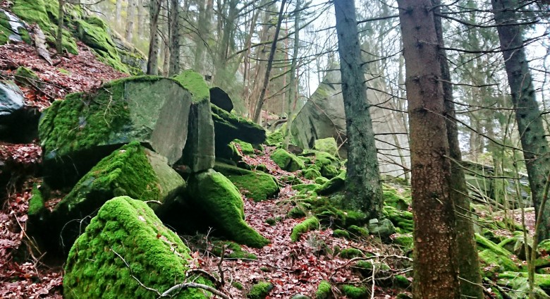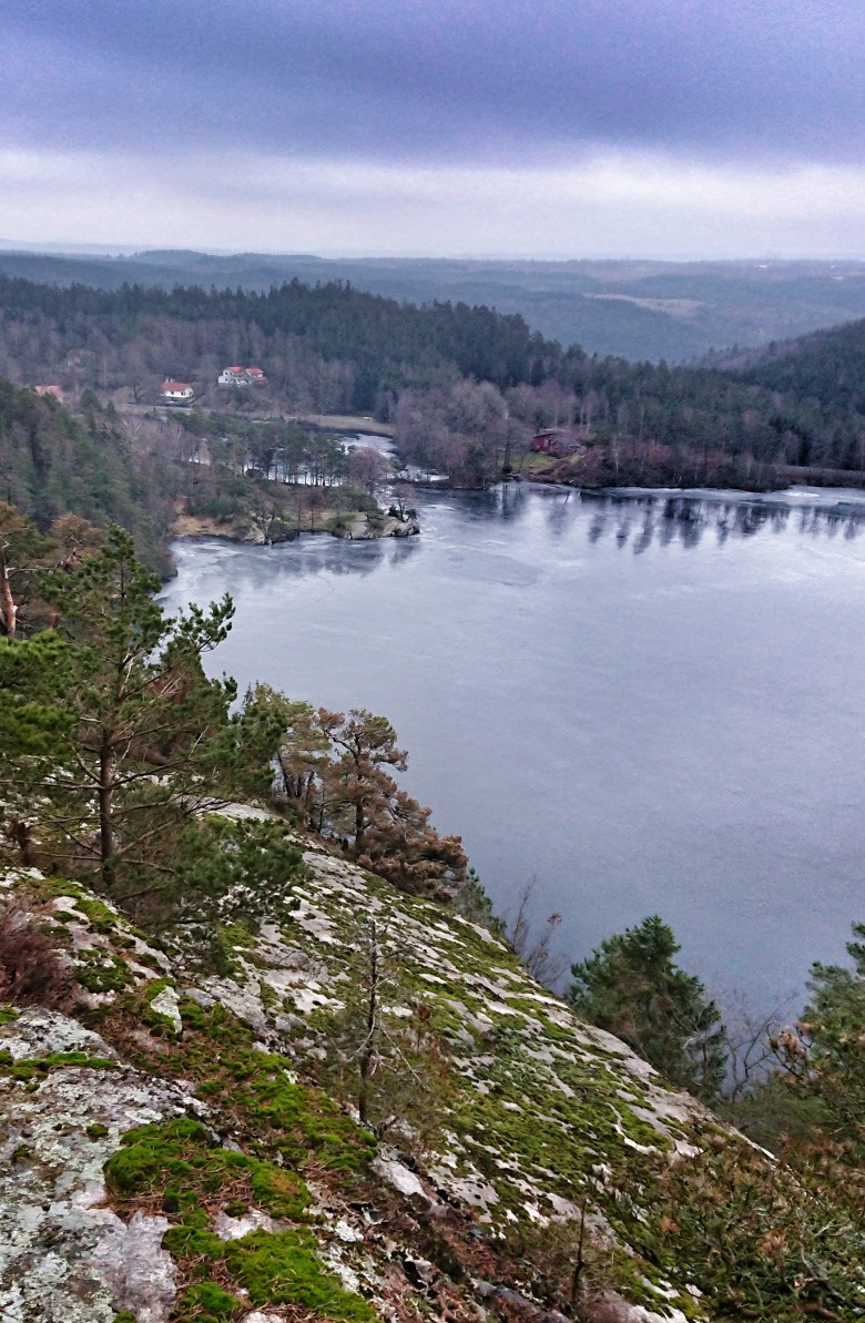 Kring Horred kommer jag ut på asfalt, skönt efter en mil eftergivlig grusväg att få något som svarar under fötterna. Märker det också på att farten går upp. Jag springer förbi kyrkan, genom utkanten av byn och ut på den lilla vindlande asfalterade vägen på norrsidan av lilla Hornsjön. Även här duktigt vattensjukt i markerna och det känns helt ok att stanna på asfalt ett par kilometer. Lite flackare och aningen mindre böljande här, men naturen är storskuret mäktig med branta klippor ner mot den lilla sjön jag springer längs. Jag samlar mig för dagens demonbackar bortåt Letebo, där jag kommer in på Sätila Trails sträckning in i Letebo naturreservat och uppför den mäktiga klippbranten till Helsjöns folkhögskola. Från den nordligaste fliken av Stora Hornsjön upp till toppen av Texelberget klättrar man tvåhundra höjdmeter i ett par etapper och det är ofta så brant att man når marken framför sig med händerna. Härlig omväxling men suger i benen. Sista biten upp till toppen går på en klipphylla med magnifik utsikt ända ut mot havet, mot Stora Hornsjön en bit bort och ner mot Helsjön som ligger nästan rakt under fötterna. Kittlande!