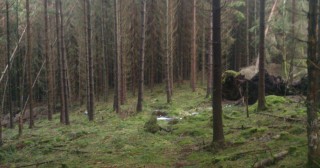 Från parkeringen sticker jag direkt in i djup mossgrön granskog på en liten stig som stundtals löser upp sig i intet bara för att åter dyka upp längre fram. Det gör nu inte så mycket - undervegetationen inne bland granarna är inget under av biologisk mångfald utan istället lättlöpt och sviktande. Det är dock ganska mycket uppför, jag snirklar mig upp, granarna lämnar över till blandad lövskog med mer livaktig markvegetation; men det finns en svagt synbar stig att följa söderut, här och var förstärkt med kavelbro genom de värsta kärrhålorna. Det är inte uppenbart att de smala tvärliggande trästammarna underlättar löpning men man ser åtminstone var stigen tar vägen.