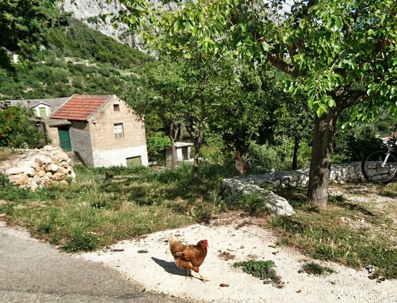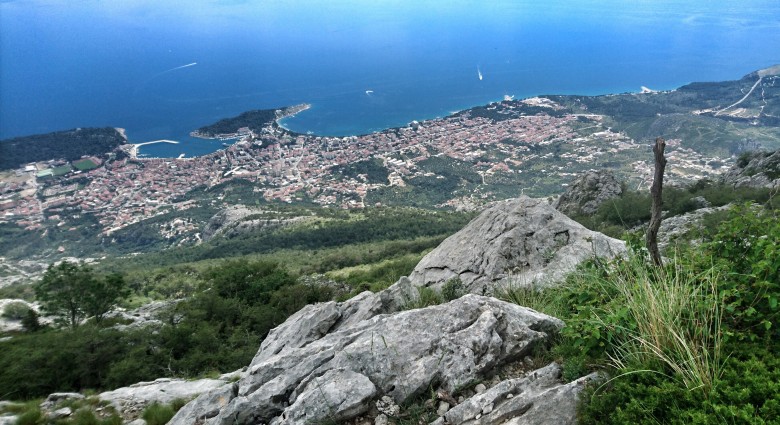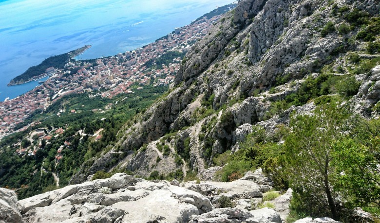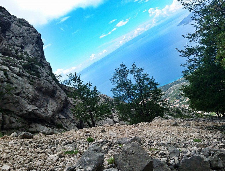 Ganska krånglig nedstigning i ett par hundra höjdmeter innan jag kommer ut på vägen lite nedanför och öster om den punkt jag hittade den på uppvägen. Nu väntar runt tre kilometer höglänt och slingrande asfaltväg bort mot toppen Vosac som tornar upp sig rakt ovanför Makar och Makarska byar. Det går fint att klämma upp farten på den snälla och mjukt slingrande asfalten. Det är några tunga uppförslöpor men generellt får jag lämna tillbaka ett par hundra höjdmeter i utbyte mot gott tempo i rätt låg ansträngning. Bra.