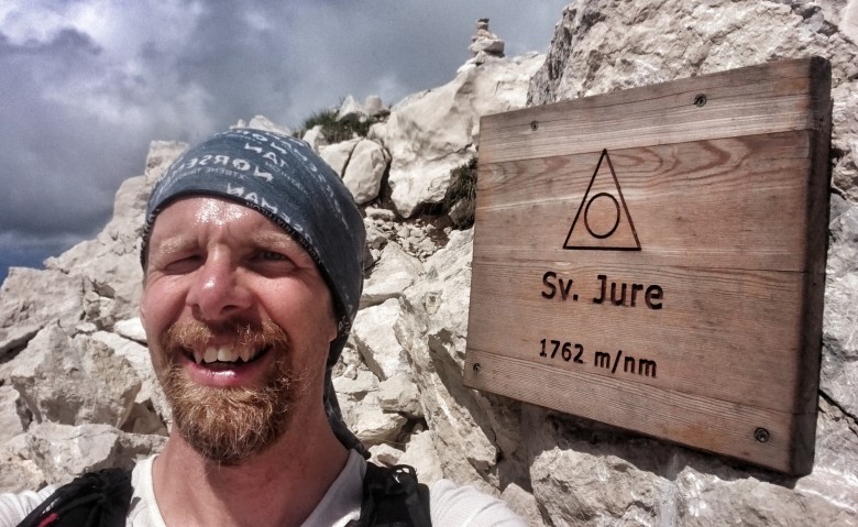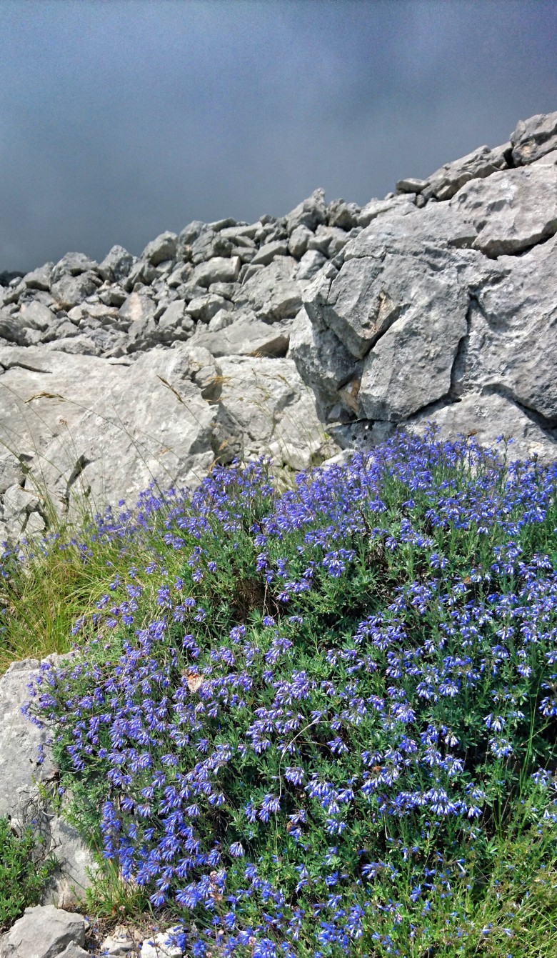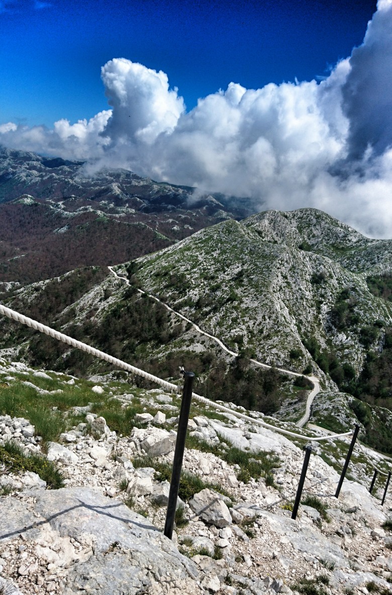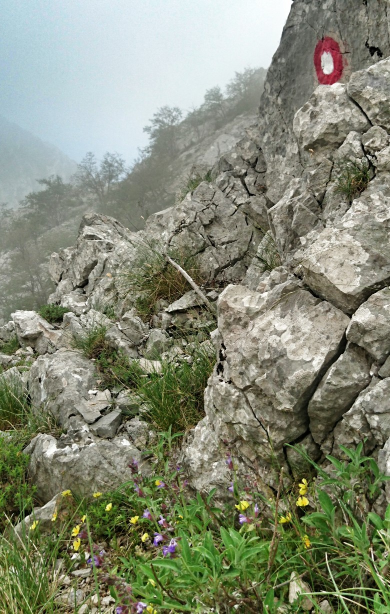 Vid 1300 meter viker jag in på en mindre led som ska ta mig raka vägen mot huvudtoppen Sveti Jure. Här är ledmarkeringarna lite eroderade och svårare att se. Samtidigt är jag inne i molnen och sikten minskar, och dessutom flackar stigningen ur och det blir lite lurigt att orientera sig. Jag får stanna upp och kolla kartan så jag är säker på att den lilla stig i högt gräs jag nu följer faktiskt är rätt. Jag fortsätter en bit till, molnen skingras och jag hittar åter de trygga ledprickarna. Det är en kilometer till den sista stigningen mot toppen och leden går upp, ned och längs skarpa kalkstensryggar, bitvis i höglänta skogsmarker och bitvis i karga barblåsta stenpartier. Inte lättlöpt men det funkar ändå med lite försiktighet.