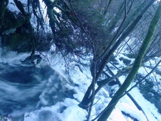 Fortsätter på gröna spåret upp till Årekärr. Skarsnön ger med sig i de sjupaste skogspartierna och det blir en del mjukt sockervaddsplufsande. Närmare Årekärr är det dock hårdare och fin löpning igen. Stannar än en gång vid skvaltkvarnen, käkar en banan och kollar in det lilla fallet - nu åter friare från is. Dricker lite vatten innan jag stuvar undan överdraget och springer lätt norrut. Går ganska segt men jag håller ihop något som åtminstone liknar löpning om man ser det på håll.