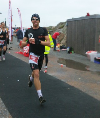 Varvning, jag kollar på målklockan och försöker räkna efter vad jag har för möjligheter att göra tider. Förra året gick jag runt på 4:27 men det var med en avsevärt kortare och lättare simsträckning och kanske även en lättare cykling. Tre varv eller 15.9 km kvar och jag kommer fram till att jag har 70 minuter på mig för att greja 4:30. Känns lite tajt - 23:20 på ett varv borde vara görbart men tempo kring 4:20/km är förbluffande tufft just nu. Slår bort tankarna på tider och försöker hitta en bra men ansträngd nivå i löpningen, vilar i nuet och bara springer så fort det går. Uppför vid varvningen igen, blir påhejad av fru och barn och det lättar upp. Entusiasmen bland flaggisar, funktionärer och vätskelangare är också slående, trots det risiga vädret lyser Skärhamn med omnejd av tävlingsglädje och det är underbart roligt att springa i cirklar kring det lilla samhället.