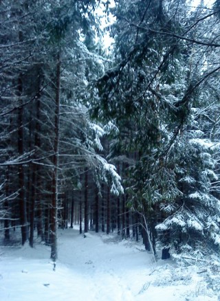 Över Lindomeån och upp mot kyrkan, fortsatt vinterväglag. Lätt joggfart, bara lite snabbare än sexminuterstempo får räcka idag. Sparar vaden till en sämre dag, det är ändå hopplöst att försöka hålla högt tempo på sådant här underlag. Och mot kyrkan är det uppför uppför uppför innan jag når Barnsjövägen och Dalavägen, här väntar dagens andra stora vägfynd - som visserligen inte heller det är mig nytt. För här går den övergivna gamla allfarovägen söderut rätt in i djupaste barrskogen. Med snön som markör ser man tydligt att hålvägskaraktären hos stigen inte enbart är formad av moderna skogsmaskiner, här har folk passerat i århundraden, lokalhistoriker vill gärna härföra rutten ända tillbaka till förra millenieskiftet. Det får vara hur det vill med det, stigen är i det närmaste otrampad idag. Ett par fotspår kommer och går, bitvis är det slät och helt fläckfri snö jag trycker mig igenom. Dock mindre än decimetern överallt så det är inte svårlöpt, tvärtom är vissa av passagerna lättare än sommartid, då stigen ofta står djupt under vatten.