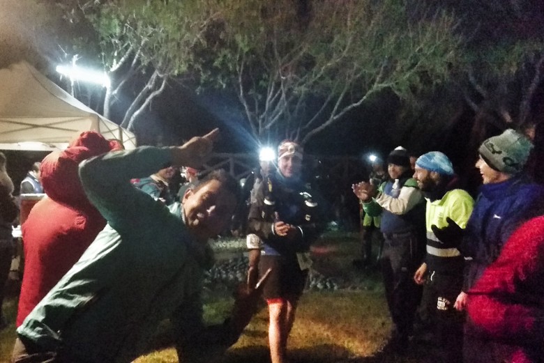 Spöklik känsla att springa längs kammar högt uppe i bergen med milsvid utsikt över byar långt bort, vid sidan om stigen försvinner marken, det är omöjligt att veta om det är en liten brant och en avsats eller ett tusenmetersstup - jag ser till att hålla koll på fötterna och stigen framför mig. Förutom ett par leriga och hala nedförslöp är underlaget ganska bra. En del sten, en del fin stig. Det blåser kallt om fingrarna på en del av topparna och jag ångrar att jag inte tog några tunna handskar - men annars är natten lugn. Vi trippar på och fältet glesas successivt ut och man får börja ta ansvar för navigerandet själv. En ambivalent hängd reflex och en saknad pil på en asfaltsbit leder till en kort fellöpning. Bannar mig själv och aktiverar ruttvisningen i klockan. De första gryningsstråken börjar synas på horistonten och tupparna börjar gala, löpning nedför i gles tallskog med moss-suddar på marken som är närmast självlysande i det tilltagande ljuset, mycket läckert. Och jag kan så äntligen släcka pannlampan vid sju - halv åtta på morgonen.