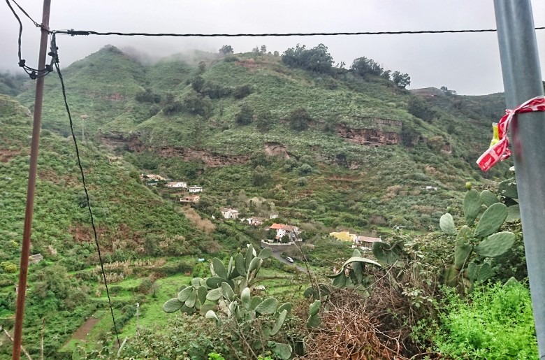 Annars är dagen fin; det är mycket upp och ned mellan dalarna; ett pass att passera per kontroll ungefär och det går inte jättefort men jag kommer ändå in i Teror i paritet med mitt 24-timmarsschema eller till och med lite snabbare. Naturen är omväxlande och vyerna fantastiska. Det är mer domestiscerat här än de första fyra milen och förutom tuppar hör man skällande hundar och skriande åsnor på många håll. Vädret är perfekt, lite disskiktad sol och stigarna torkar upp, det är fortfarande ohelmult brant men åtminstone inte halt längre. Men efter 54 kilometer känner jag en tilltagande utmattning i låren. Resten av kroppen är ok, jag är lite seg men mår i stort bra i övrigt. Men quadsen protesterar. Och jag behöver dem för att komma nedåt.