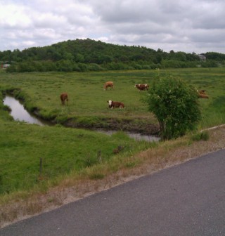 Vätskebälte har jag med men jag fyller inte flaskorna förrän vid fotbollsplanen, en halvmil in i passet. Känns onödigt att släpa på vätska i onödan, det enda det kostar mig är en liten omväg in i utmarken bakon Norra Bergsvägen; en liten gångstig till sommarstugeområdet i Vassbäck, på fastlandssidan av stora vägen. Där kommer jag upp på den klassiska Gång/Cykel/Ridbanvallen söderut. Var artonde minut ungefär surrar klockan till och informerar om en trekilomterspassering, annars är det lugnt. Tankarna vandrar, stegen är lätta och bekväma. Jag flyter långsamt in i min långpassbubbla. Korna slappar lojt invid banvallen; viken vid Rågelund ligger nästan stilla. Banvallen skär stranden i en rät linje och en kilometer bort väntar Frillesås. Byn utstrålar även den något slags söndagsslummer, jag korsar Löftaån på den fina gamla stenvalvsbron och åvattnet flyter långsamt med något slags brun motvillighet ut mot havsmynningen, inbäddad i lummig grönska. Tankarna går till bröderna Dahl eller möjligen Den sista färden, vilket det blir är antagligen beroende på vilka fördomar man har om Frillesåsborna. Jag ser dock ingen som plinkar på någon banjo utan kan fortsätta i min lugna långpasslunk längs Ginstleden.