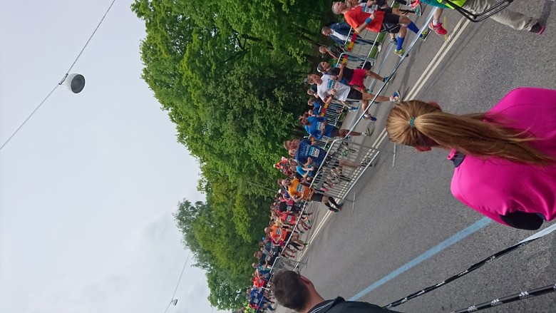 Trots allt kommer jag till Ågrenska tältet vid Slottskogsvallen i rimligt god tid och för en snygg blå tröja och en ryggsäck med en stor 1:45-flagga. Piffigt. Hinner träffa min vän Juristen med familj innan det drar ihop sig till start. Får lite frågor om mitt farthållande i startfållan innan vi kommer iväg och jag säger nåt om att vi får se hur det går i början, om det är trångt och att det finns gott om tid att hålla fart på Hisingen om det kniper. Samt att, om det fullständigt skiter sig kommer jag att plocka ner flaggan.
