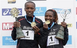 På herrsidan var det lite mera kamp, men bara lite. Kenyanen Martin Mathathi (VM 5:a på 10 000m i Daegu) var utmanad, främst av landsmannen Jonathan Maiyo, till ungefär halvvägs men sedan var det Mathathi för hela slanten. I mål kom han efter 58:56 och slog i o m detta världsrekordhållaren Zeresnay Tadesses banrekord på 59:05. Maiyo höll undan som tvåa och nådde målet på 59:27, 25" före London Marathon segraren Emmanuel Mutai.