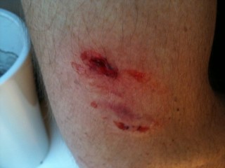 Efter dryga timmen mötte jag några av rätt många lördagsflanerare, och tänkte inte så mycket på det, utan var "inne i min värld". Men plötsligt ser jag i ögonvrån en stor rytande hund som hoppar rakt mot mig utan förvarning. Det kändes som hunden siktade bra mot strupen, men jag han få upp en arm precis innan tyngden av hundens säkert 30-40kg slog om kul mig i rätt bra kraft ut i en snödriva. Ibland är det tur med mjuk snö....Husse verkade lika förvånad och skärrad, men lyckades kämpande få loss hunden. Lite chockad reste jag mig och konstaterade att softshell jackan och de två skalplaggen under gjort sin insats för dagen. Hyfsat hål och lite ont i armen...