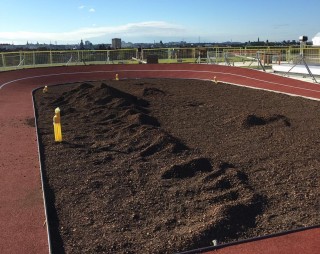 Högst upp, på taket ovanpå den nio våningar höga fastigheten vid Torsplan i Stockholm är den nu drygt 100 meter långa löparbanan klar.