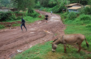 Efter att vi har avverkat vår första kilometer på kenyansk mark så säger Jackson att nu blir det uppförsbacke, så tag det lugnt i början. Vi viker in på en väg som är blöt och lerig, ofta halkar man på samma ställe. Tjugofem minuter senare börjar det plana ut och man har flåsat som en gris hela vägen.