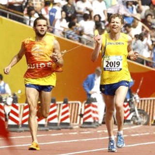 Synskadade löparen Henrik Rüffel gjorde ett stabilt lopp och sprang under tre timmar när maratonloppet avslutade Paralympics i Peking på onsdagen.