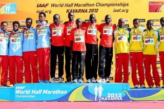 VM i halv maraton avgörs vart annat år. I våras genomfördes detta VM-lopp i Kavarna i Bulgarien. Här är prisutdelningen i lagtävlingen för herrar. 2014 får de afrikanska stjärnorna sällskap av 25 000 motionslöpare på den 21 098 meter långa banan genom Köpenhamn.