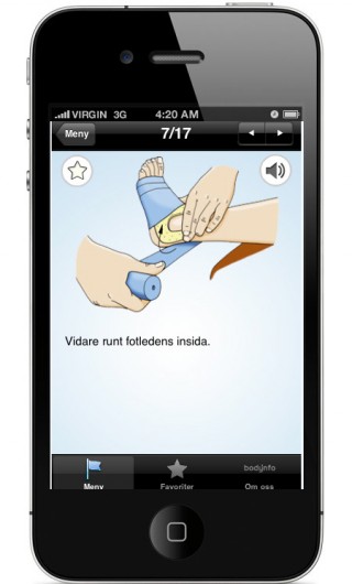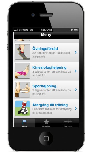 Nu lanserar man sin första iPhone-app som med bild och text beskriver hur en stukad fot ska hanteras, från det akuta omhändertagandet till rehabövningar, stabiliserande tejpning och riktlinjer för återgång till träning/tävling. Om man för egen del arbetar med andras stukade fötter är innehållet lämplig att använda till att själv få inspiration och tips avseende rehabövningar och tejptekniker eller hänvisa till när det gäller patienters egenträning.