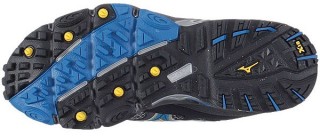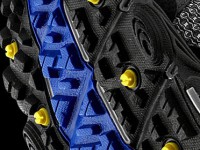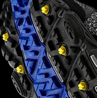 Kolla in bilden med förstoringen av slitsulan. Ser ni de gula gummipiggarna? Ser nästan ut som dubbar men är gjutna i samma material som övriga sulan. Kanske är det den dubbliknande formen eller så är det helt enkelt materialet i sulan som greppar så bra på alla underlag. Till och med på blankis där gnikar tryggt för varje steg. Det innebär ju att det finns en friktion - och därmed grepp.